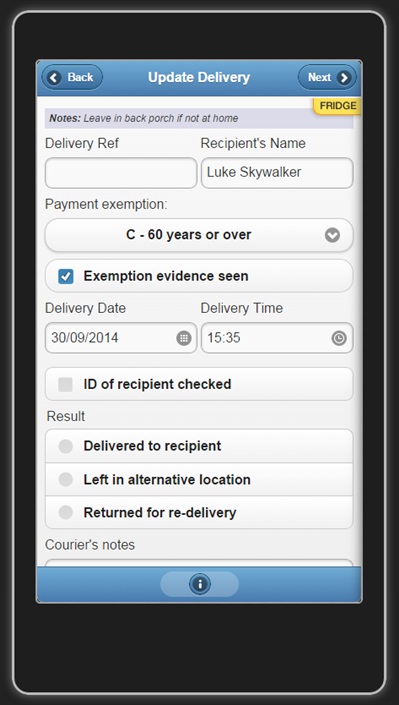 The recipient signature screen has also been updated to show the name of the recipient and to highlight the payment exemption category and if the delivery contains controlled drugs. This enables recipient signatures to be used as confirmation of payment exemption and acceptance of controlled drugs. For this reason the recipient signature screen has now been placed after the delivery details screen.