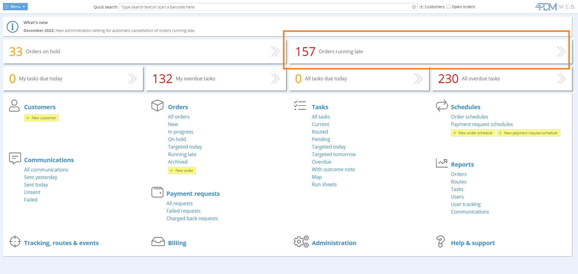 Deliveries marked “running late” appear in red on the dashboard in PDM Web.