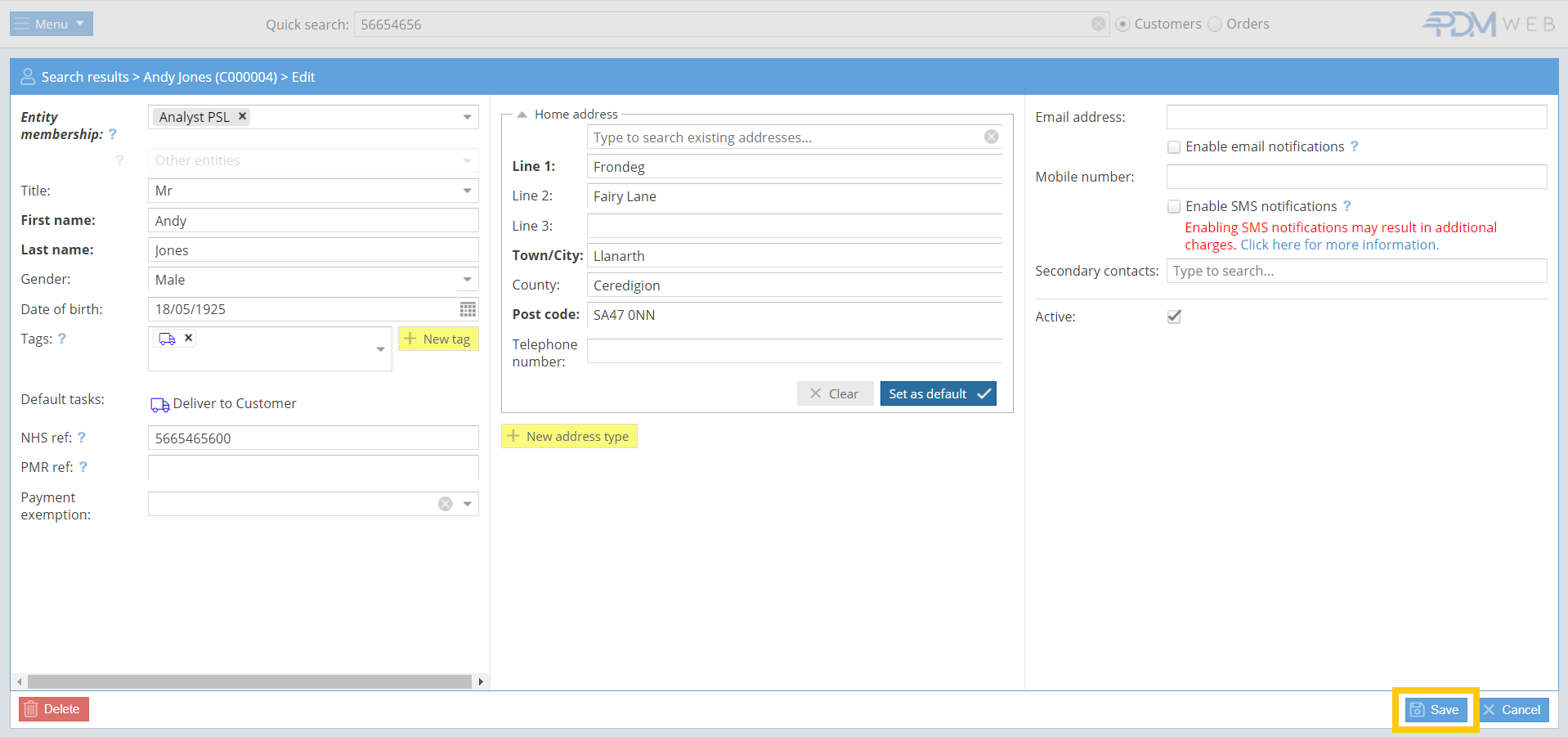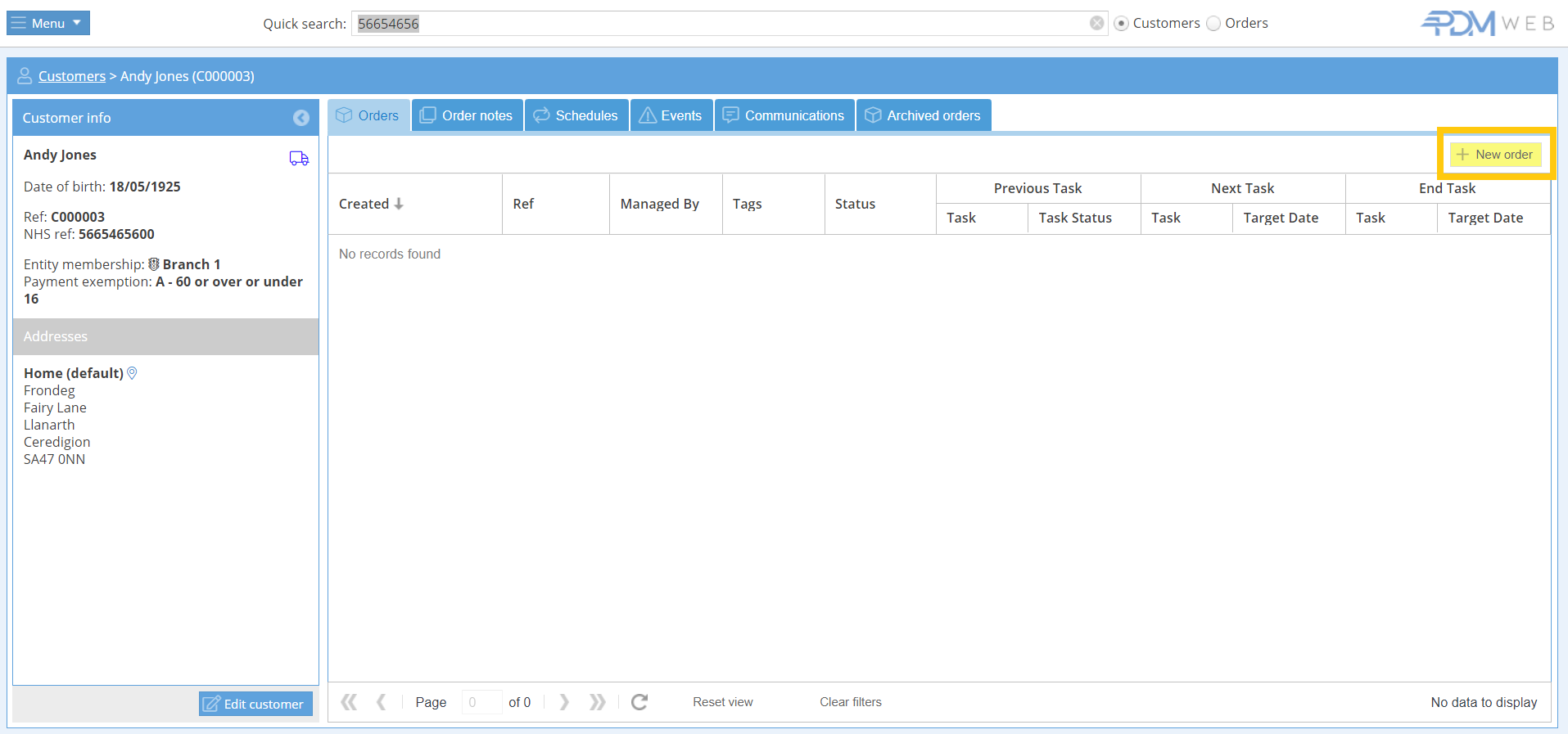 If the patient does not exist it will suggest you to add the patient by autofilling the customer name in the yellow +New Customer box: