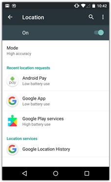 3. In the location screen check that Location Services are switched on and that the "mode" is set to "High Accuracy." See the example below:![]()