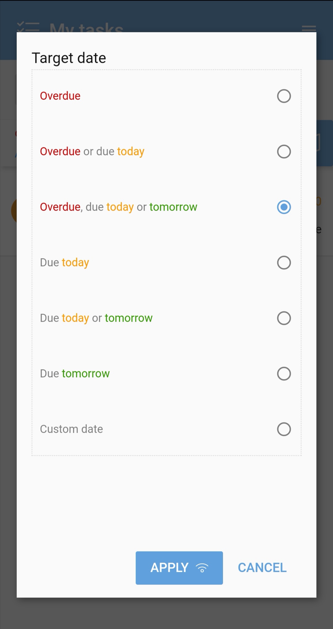 - Overdue, due today or tomorrow