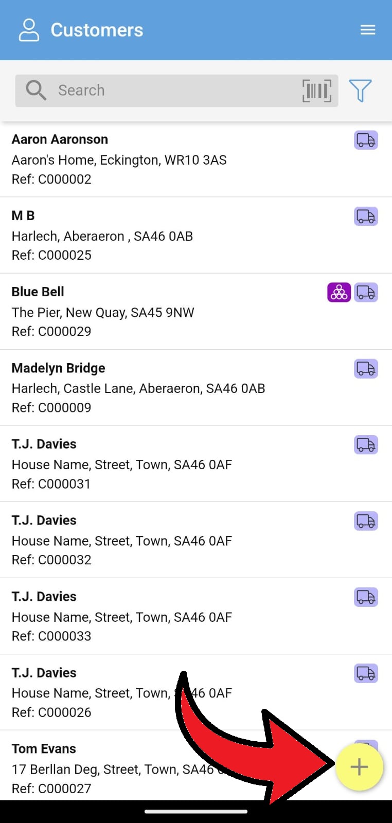 A list of existing customers will now be in view. Tap the yellow + button at the bottom right to add a new customer.