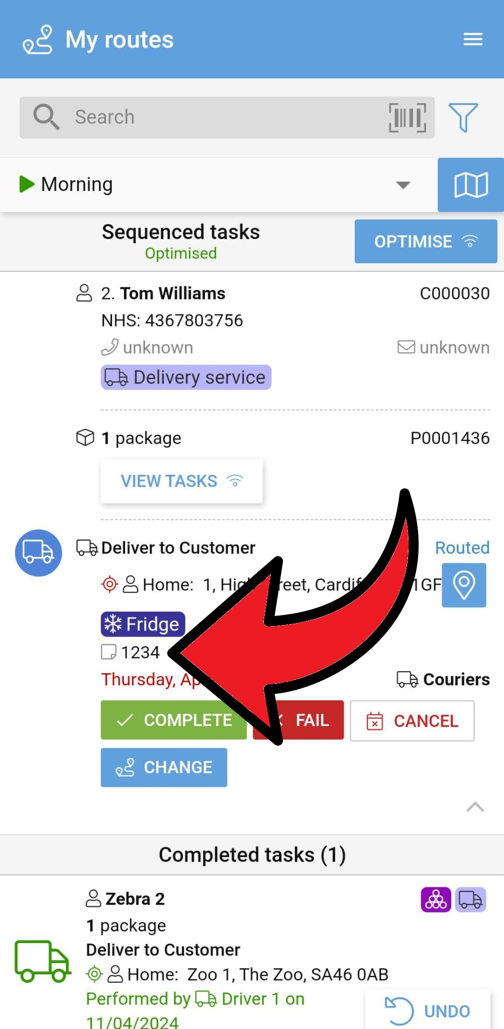 This feature is useful if, for example, a driver attempts to make a delivery but there is no answer at the door, so they fail the task. However, if the recipient then comes to the door, the driver can simply undo the Failed task and mark it as Completed instead.