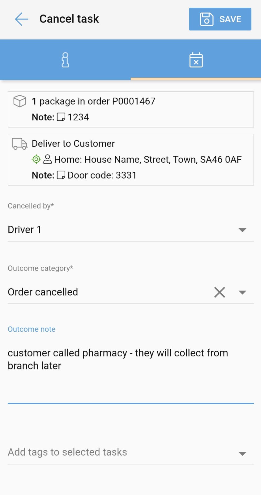 Finally, if the task has to be cancelled, tap the grey 'Cancel' button. You'll be prompted to fill in the necessary details, such as who has cancelled the task and the reason for cancellation (using the outcome category drop down menu).