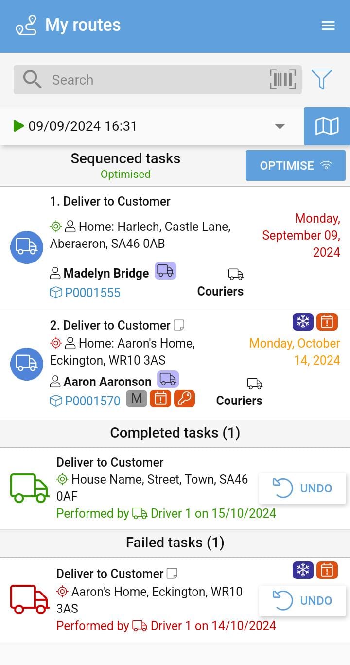 - Undo tasks (for example, if a delivery is marked as Failed due to no answer, the driver can Undo it and mark as Completed.)