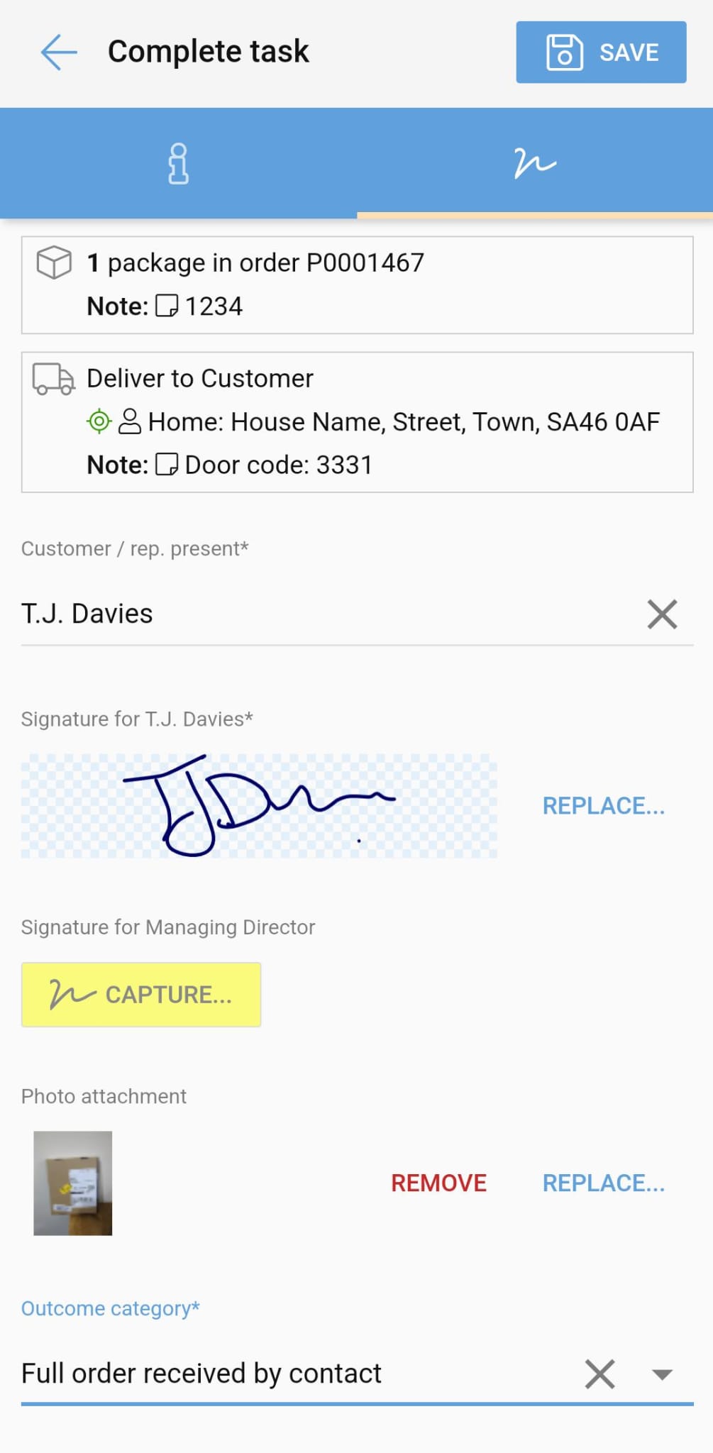 You'll be prompted to confirm any required details and have the option to capture any signatures or photos as proof that the task was completed successfully.