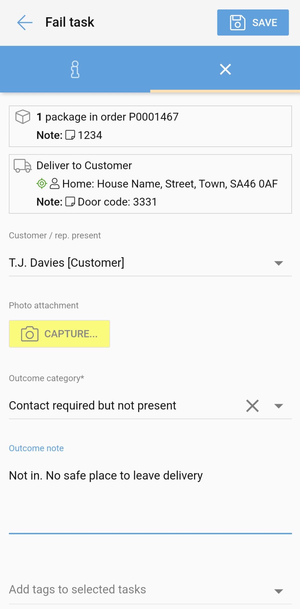 If the task has failed - for example, if the recipient was not home and the parcel needs to go back to the branch - tap the red 'Fail' button. You'll be prompted to fill in the required details, such as the outcome category and any other notes. You'll also have the option here to add a photo attachment.