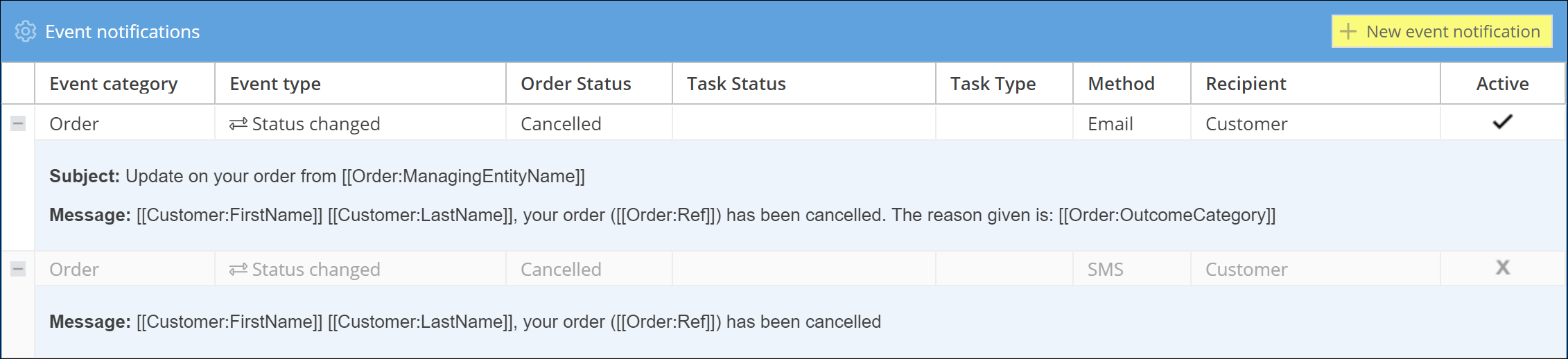 You can disable an event notification by unticking the ‘Active’ checkbox to deactivate it.