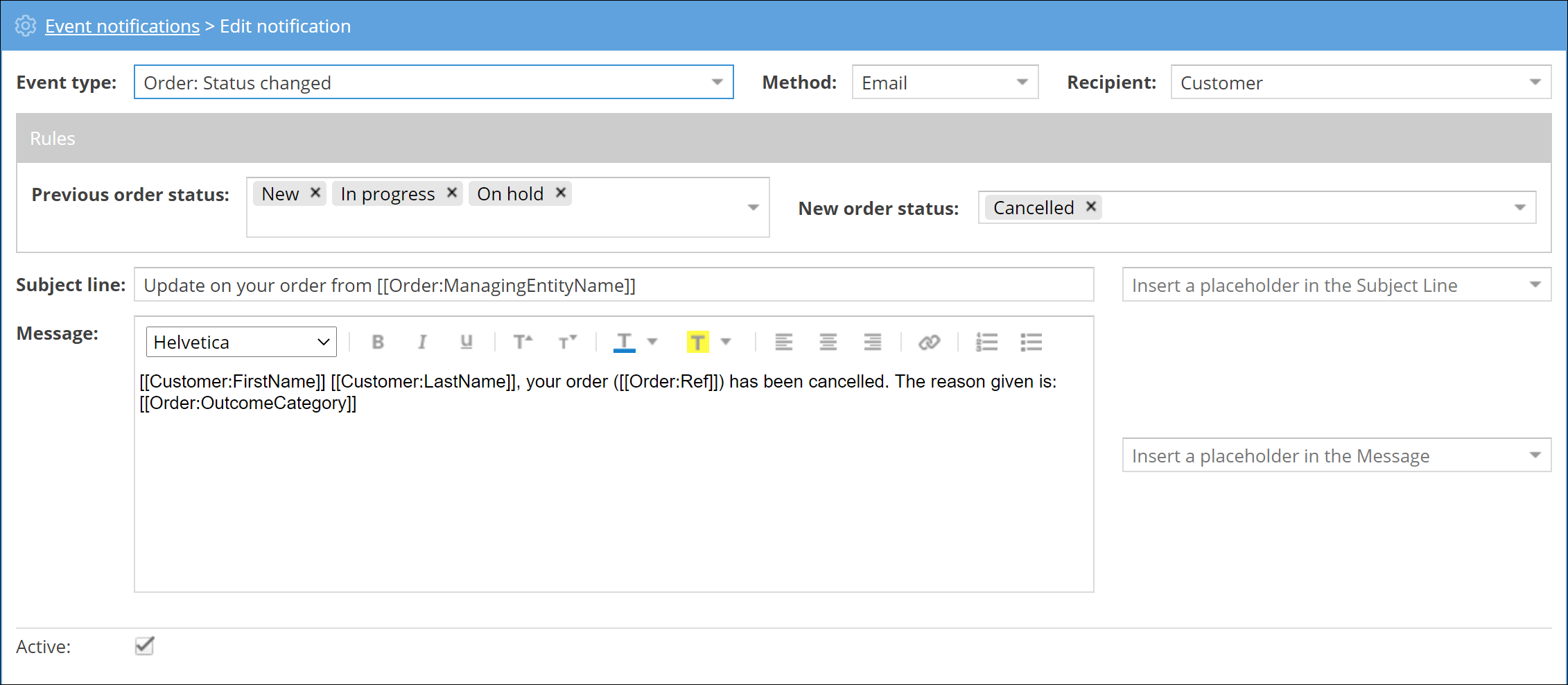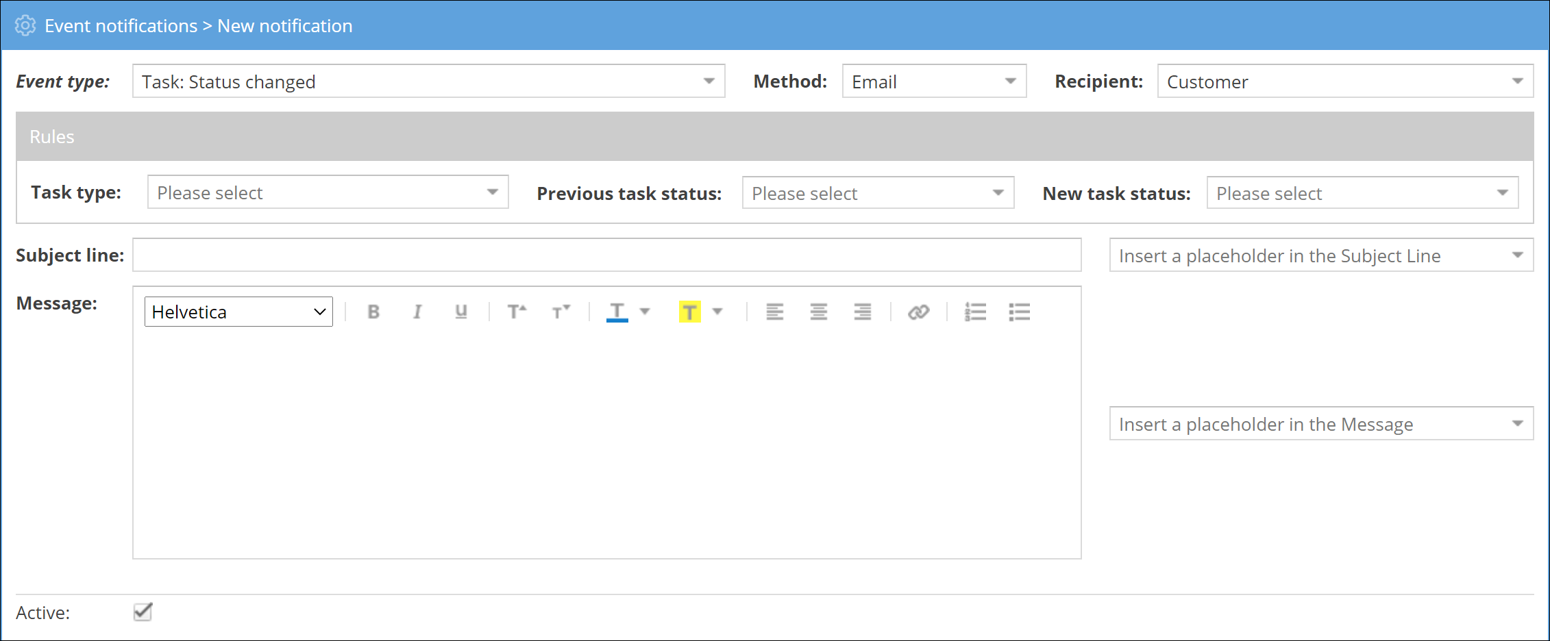 Once you've selected the event type and chosen the rules for the notification, you can write your notification text. Choose a relevant subject line and write a clear message describing the event. You can use the ‘Insert a placeholder in the Subject line’ or ‘Insert a placeholder in the message’ drop-down menus to include specific event details into the subject line and/or message.