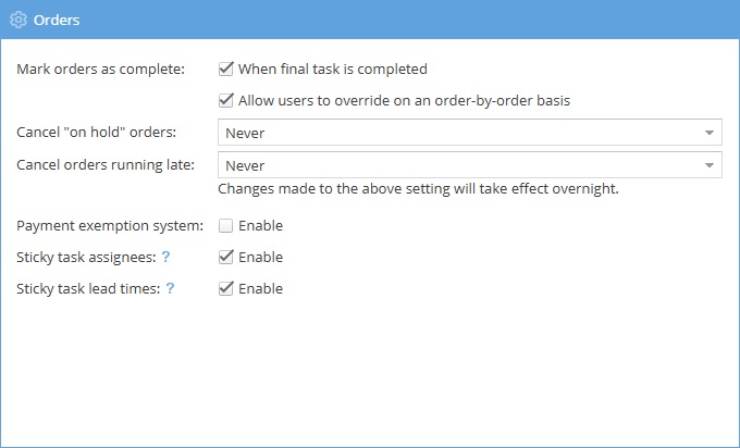 Set orders to be automatically marked as complete when the final task in the order is completed.