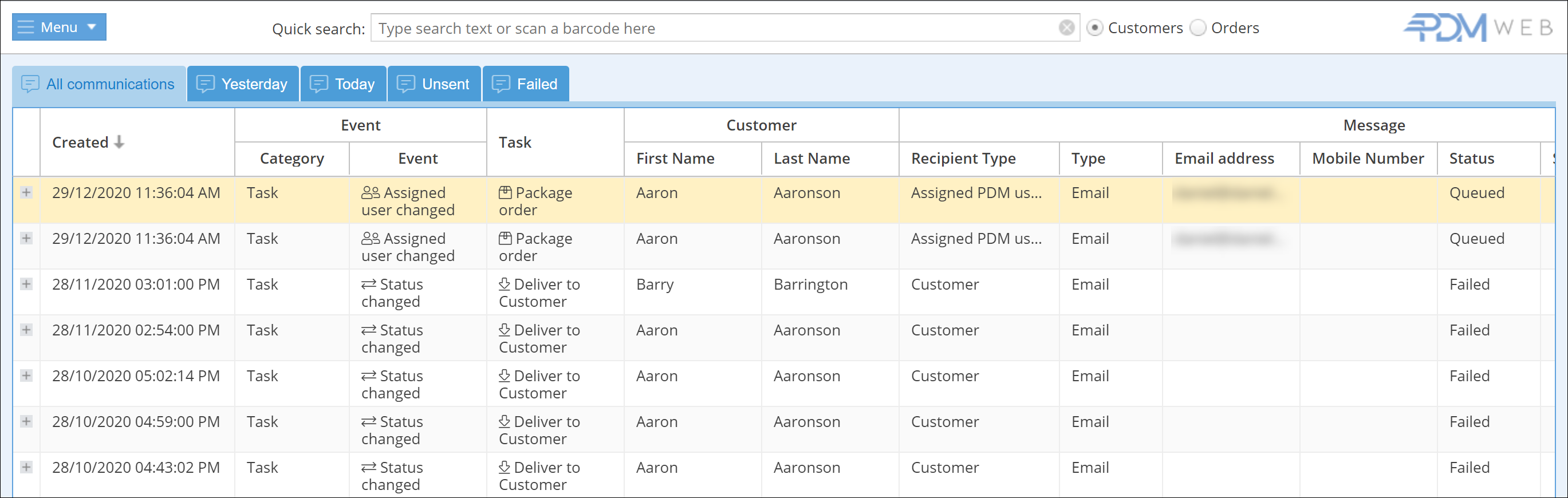 To manage any communication sent through PDM, go to the Communication module under the main menu. Here you can view the communication details, view/edit associated customers and orders, and resend/cancel communication.