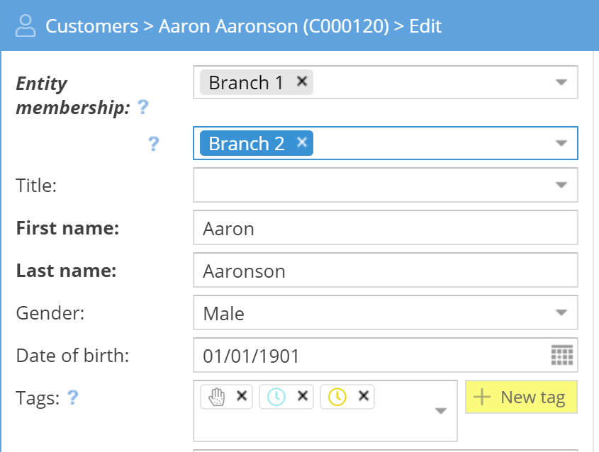 Users can assign customers to Other entities: entities they aren’t a member of themselves. So in this case, the Branch 1 site manager can go and edit Aaron’s records and assign him to Branch 2 as an additional entity.