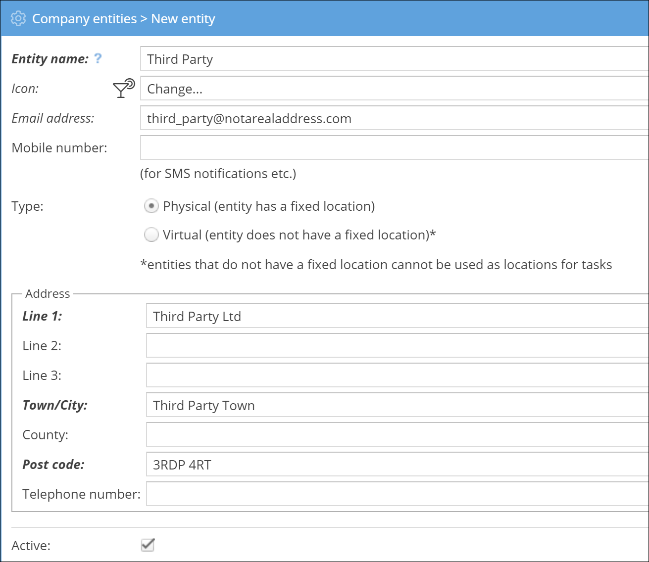 Next, create entities for any third parties who will need access to customer/order information.