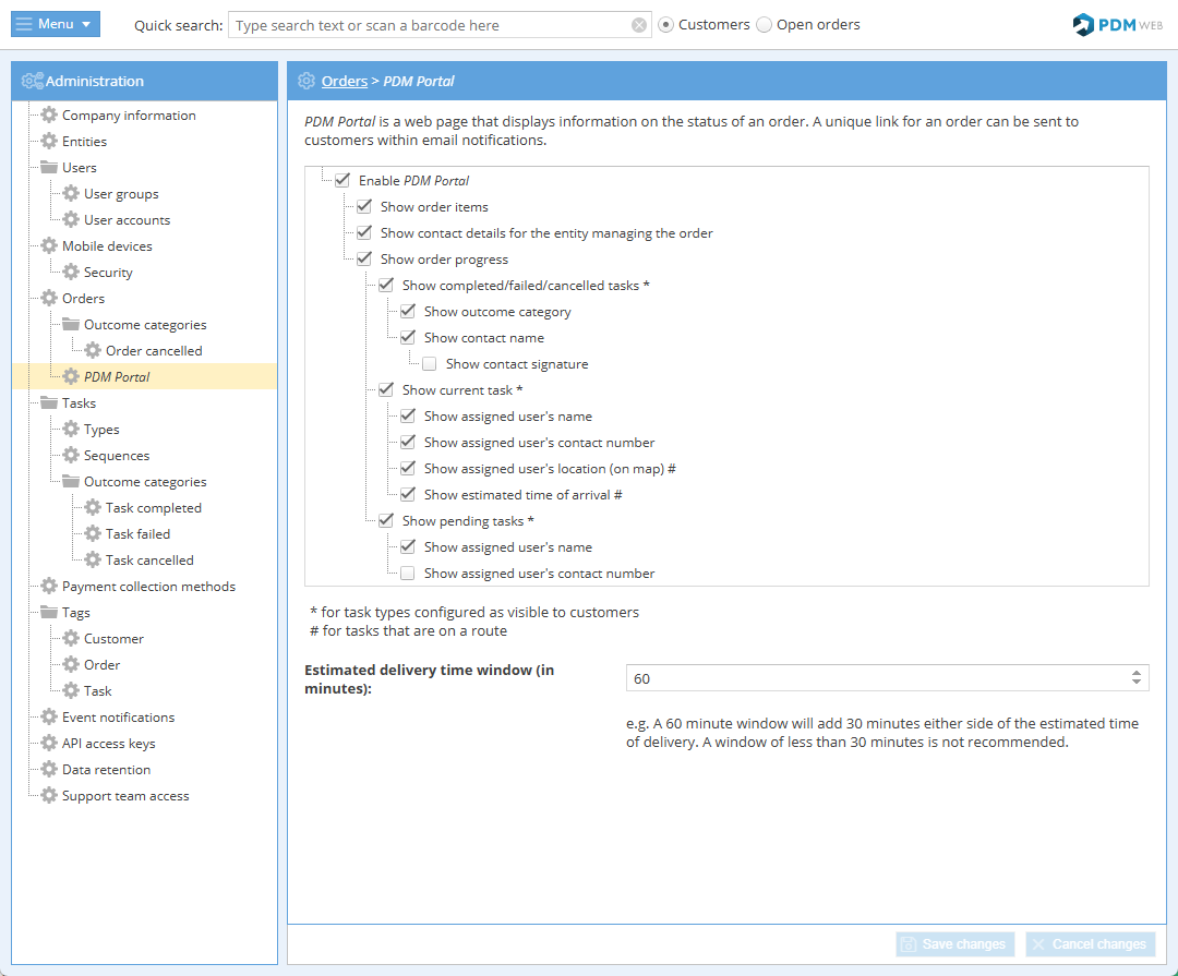 Here, choose what information is shown on the PDM Portal page, as well as how much time to allow in the estimated delivery time window.
